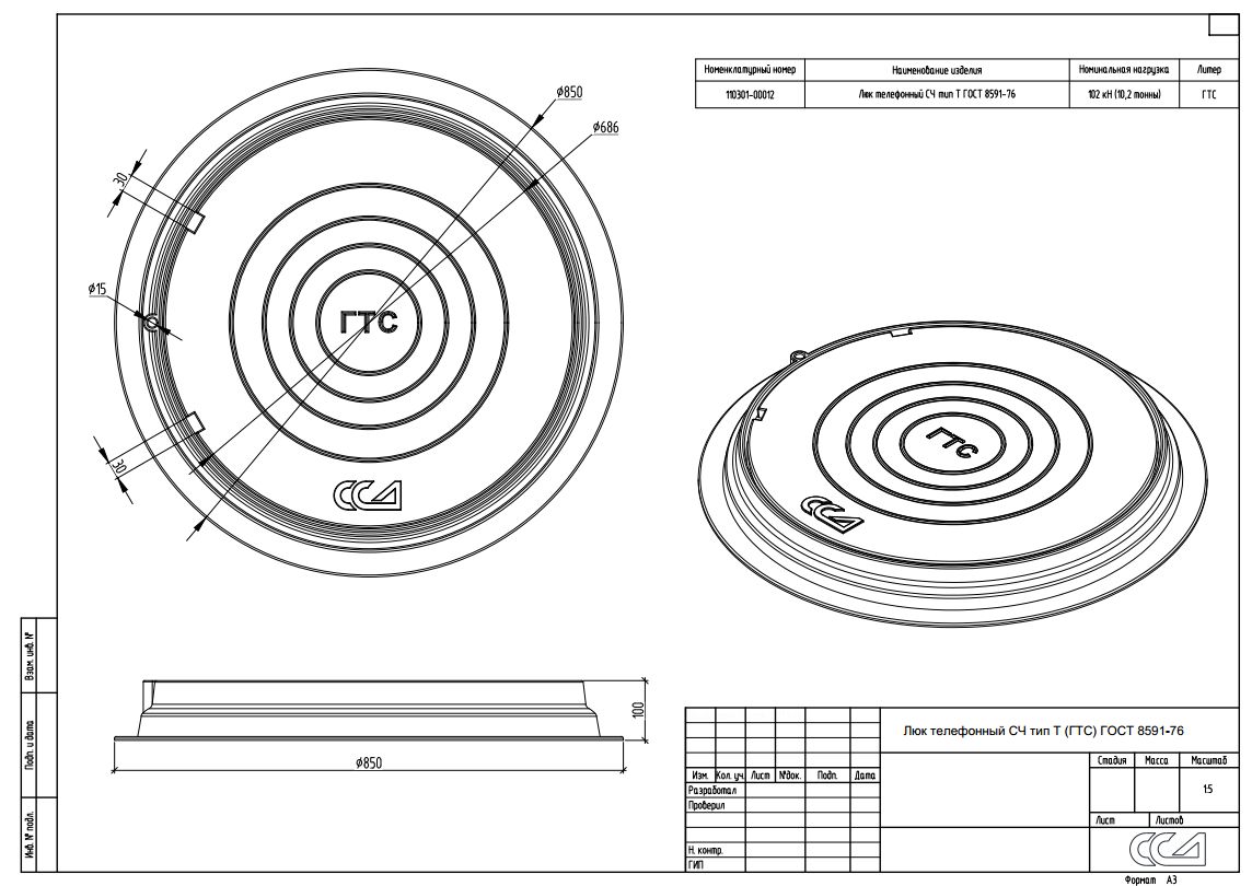 Люк изготовлен из серого чугуна марки не ниже СЧ-10 и изготовлен согласно ГОСТ 8591-76 — «Люки для кабельных колодцев телефонной канализации».