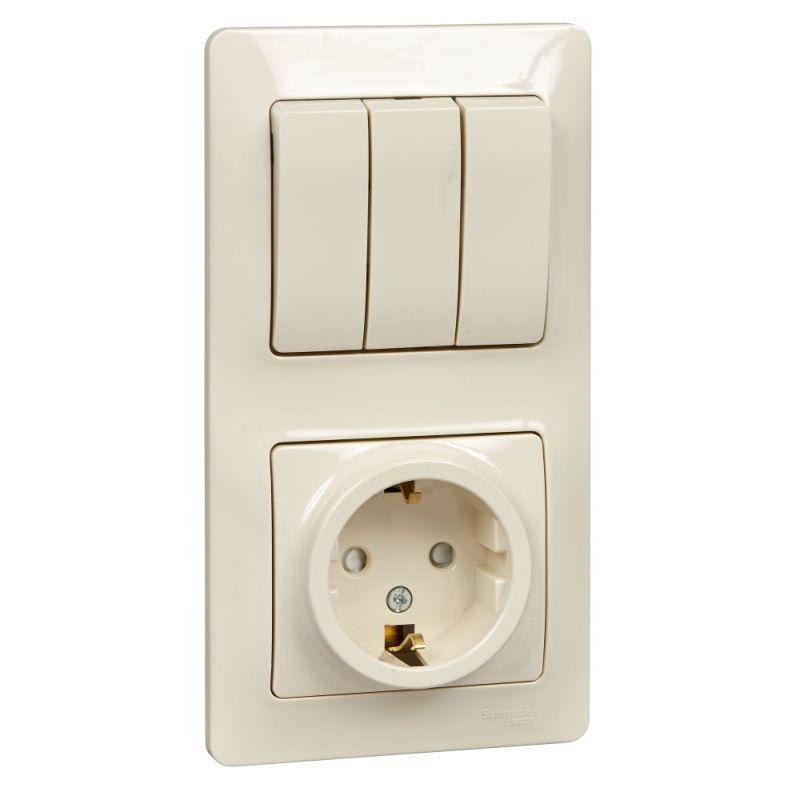 Блок комбинированный Glossa (в сборе, цвет бежевый) предназначен для сетей до 250 В, состоит из розетки с заземлением и шторками на 16 А и 3-клавишного выключателя на 10 А. - Блок удобен в применении и отлично подходит для коридора. - Заземляющий контакт обеспечивает дополнительную защиту от удара электрическим током. При наличии заземления электрический потенциал уходит в землю, защищая человека. - Трёхклавишный выключатель позволяет управлять тремя источниками света из одной точки. - Выполнен из материала PС+ASA, стойкого к УФ-излучению и появлению царапин.