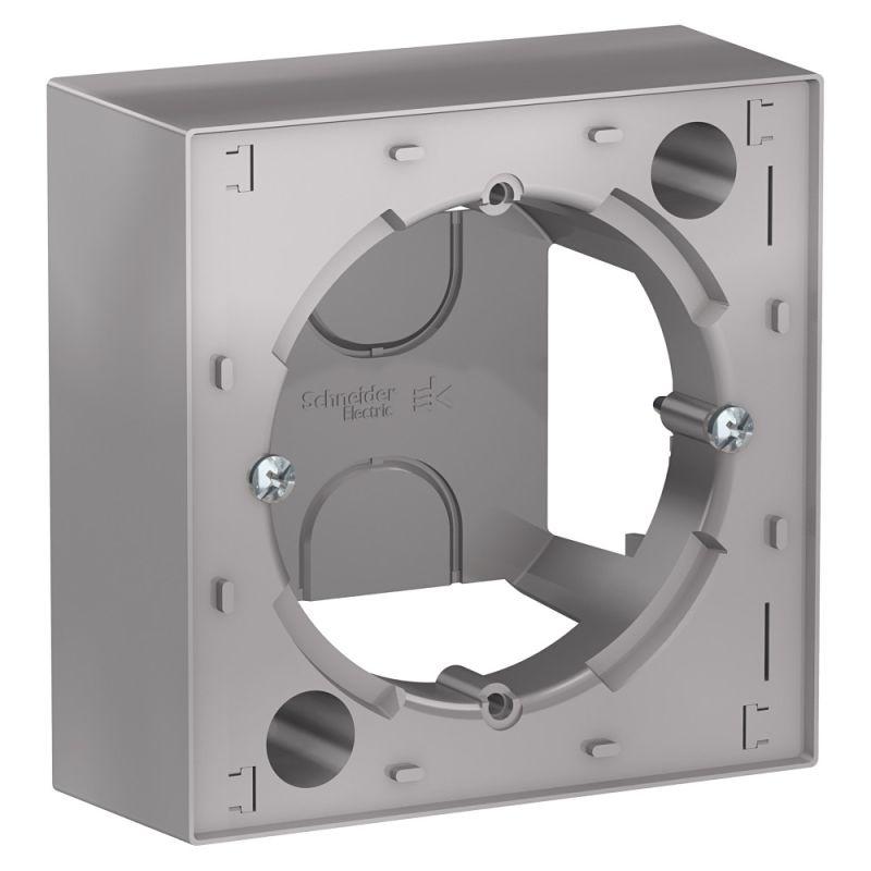 Коробка AtlasDesign (цвет алюминий) наружного монтажа. - Позволяет установить любую функцию скрытого монтажа на стену (как изделие открытого монтажа). - Благодаря специальным соединителям, входящим в комплект изделия, несколько коробок можно соединить между собой. - Лицевые детали из качественного ABS-пластика, устойчивого к царапинам и УФ-излучению.